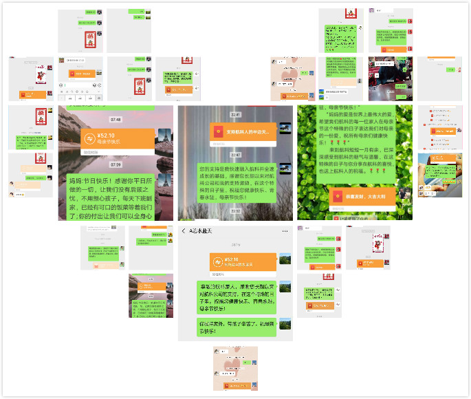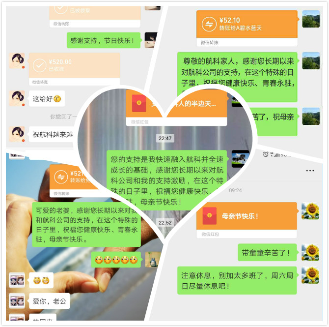 公司員工積極參與,有的在朋友圈發(fā)送給媽媽的感恩之詞并發(fā)送紅包,有的發(fā)送給家庭中的另一半,妻子,讓航科家人共同慶祝母親節(jié)的快樂(lè)!